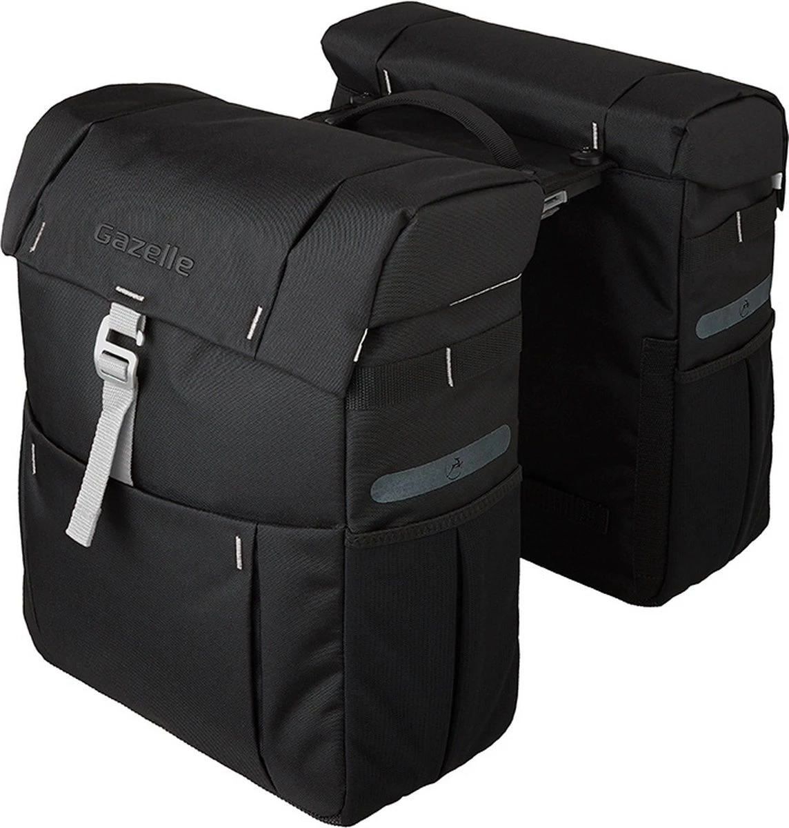 Originele Gazelle fietstas, geschikt voor MIK achterdragers. Inhoud: 37 liter Afmeting: 31 x 40 x 15 (2x) Sportieve fietstas gemaakt van waterafstotend polyester Inclusief voorgemonteerde MIK adapter Bevestig met een klik, neem in één handbeweging af Hoofdvak met 4 extra zijvakken Reflecterende logo’s